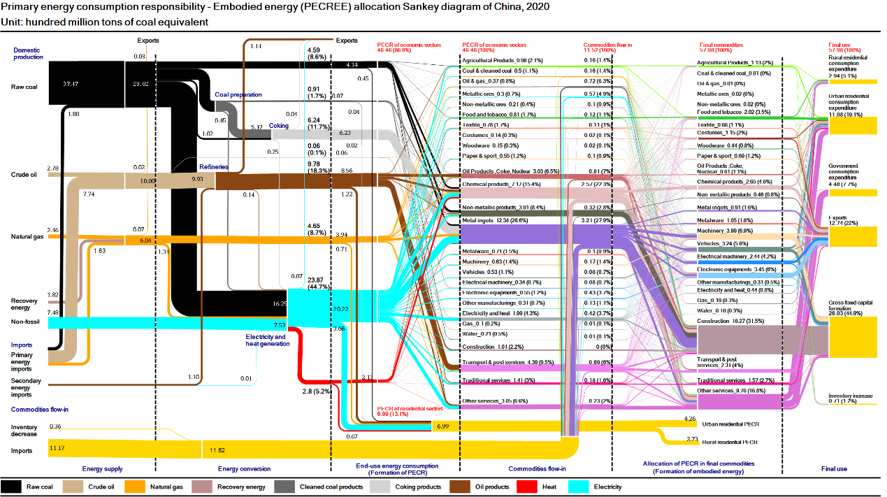作者以中国2002、2005、2010、2015和2020年的能源消费变化为案例,进行了示范和验证。研究结果显示,金属冶炼、压延加工、化学品制造等高能耗行业以及建筑商品等高能耗产品仍然是我国的主要能源消费行业和商品。固定资本形成总额在一次能源消费责任中仍然占据最大的支出类别。然而,随着国家经济的发展和转型,一次能源消费责任在能源系统的各个阶段的分配已经发生了微妙的变化。