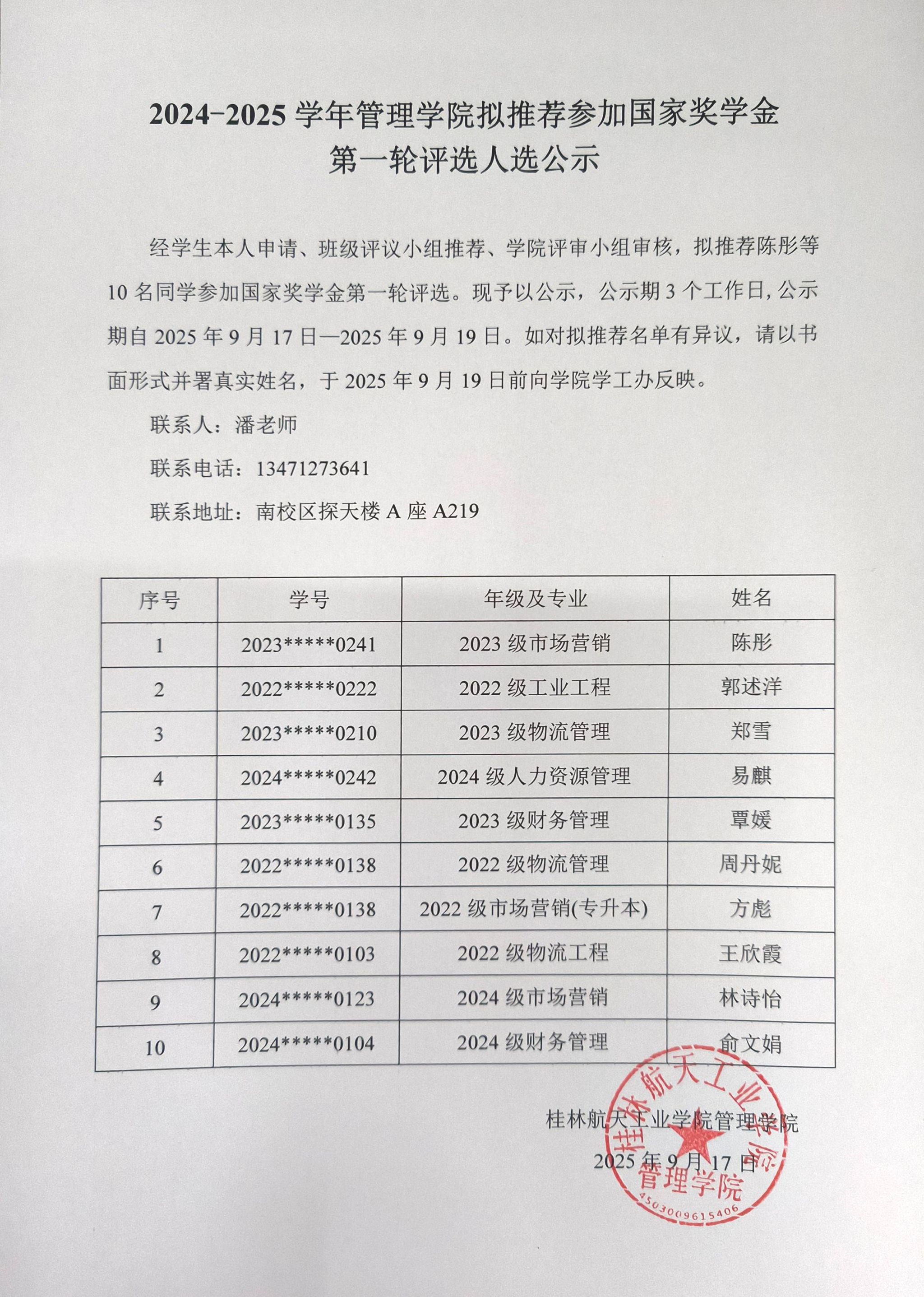 经学生本人申请、班级评议小组推荐、学院评审小组审核,拟推荐陈彤等10名同学参加国家奖学金第一轮评选。现予以公示,公示期3个工作日,公示期自2025年9月17日—2025年9月19日。如对拟推荐名单有异议,请以书面形式并署真实姓名,于2025年9月19日前向学院学工办反映。